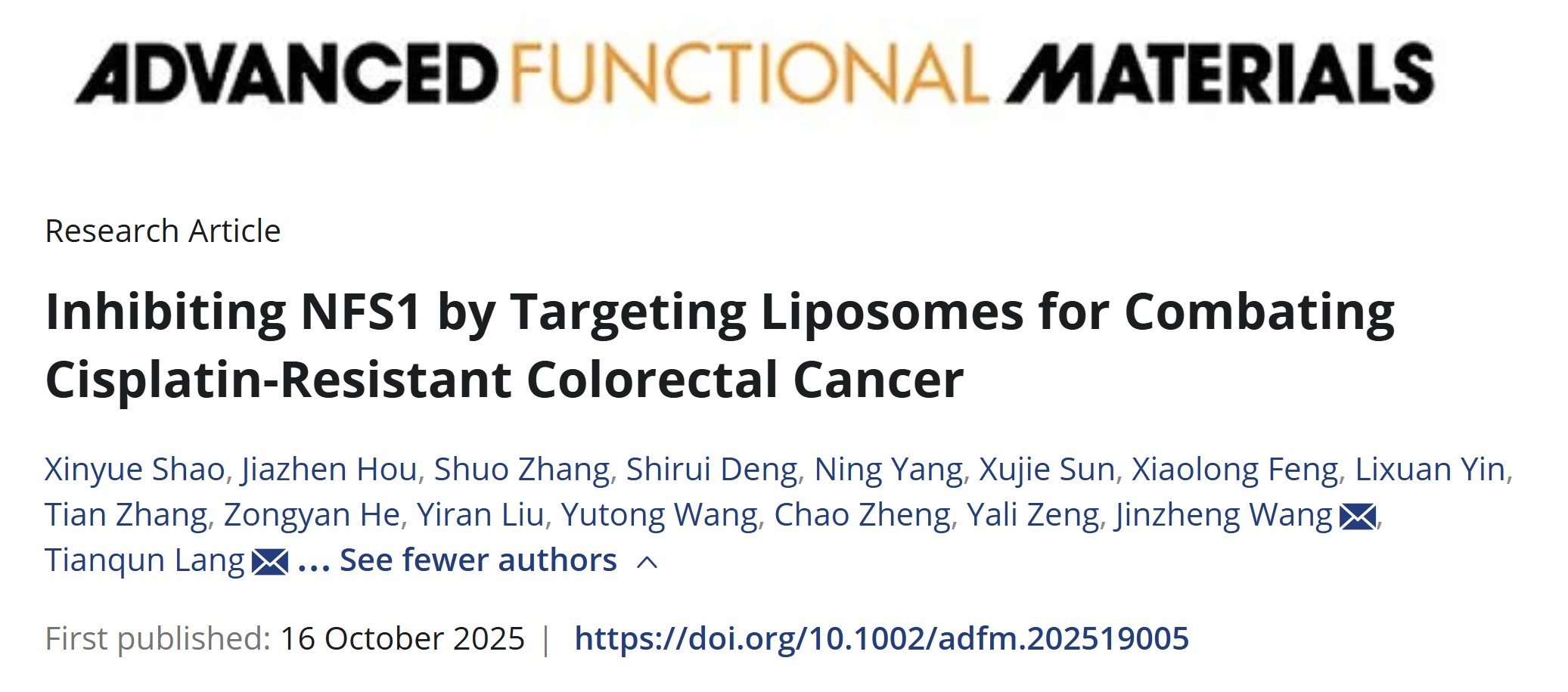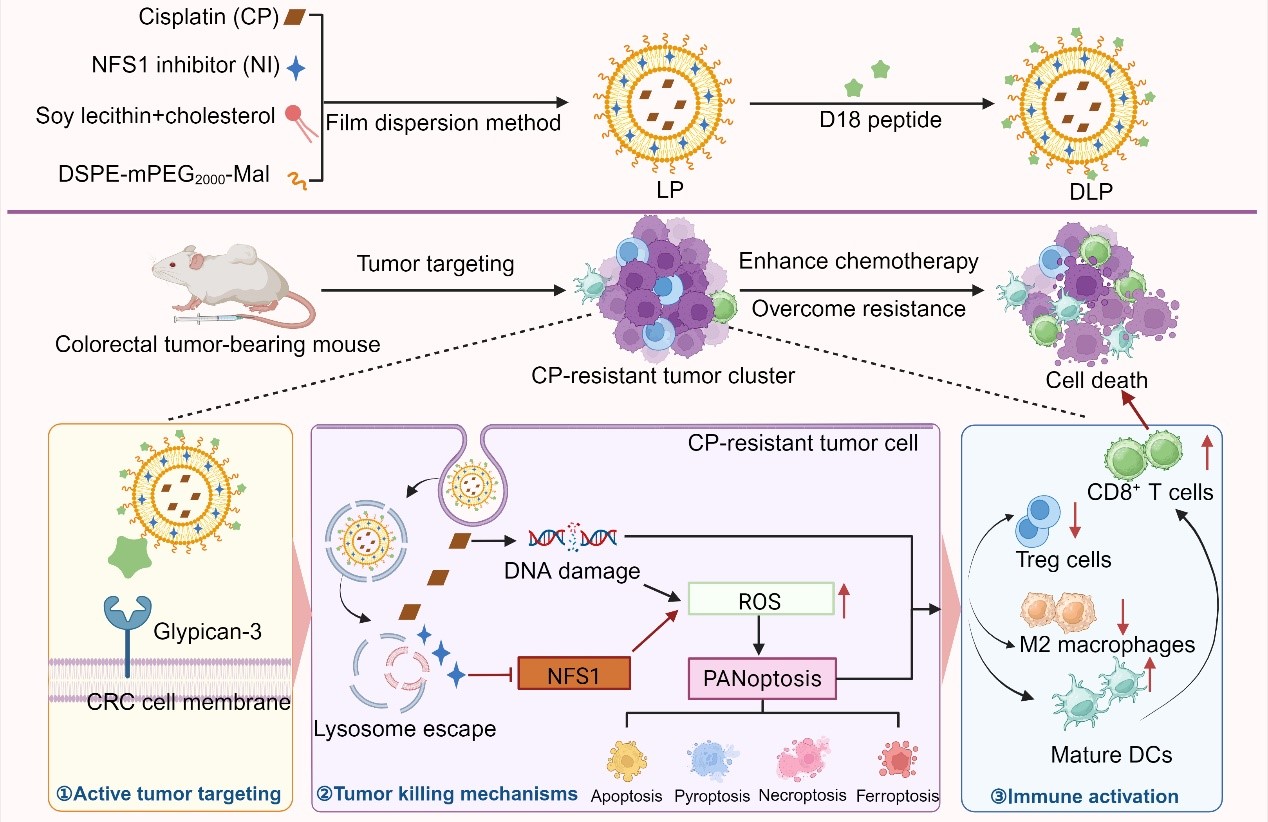 2025年10月16日,临港实验室郎天群团队联合王锦政团队在国际学术期刊Advanced Functional Materials上发表题为“Inhibiting NFS1 by Targeting Liposomes for Combating Cisplatin-resistant Colorectal Cancer”的研究论文。该研究构建了一种D18多肽修饰的脂质体(DLP),该脂质体共负载顺铂和半胱氨酸脱硫酶抑制剂以实现结直肠肿瘤靶向递药并有效杀伤耐药肿瘤。