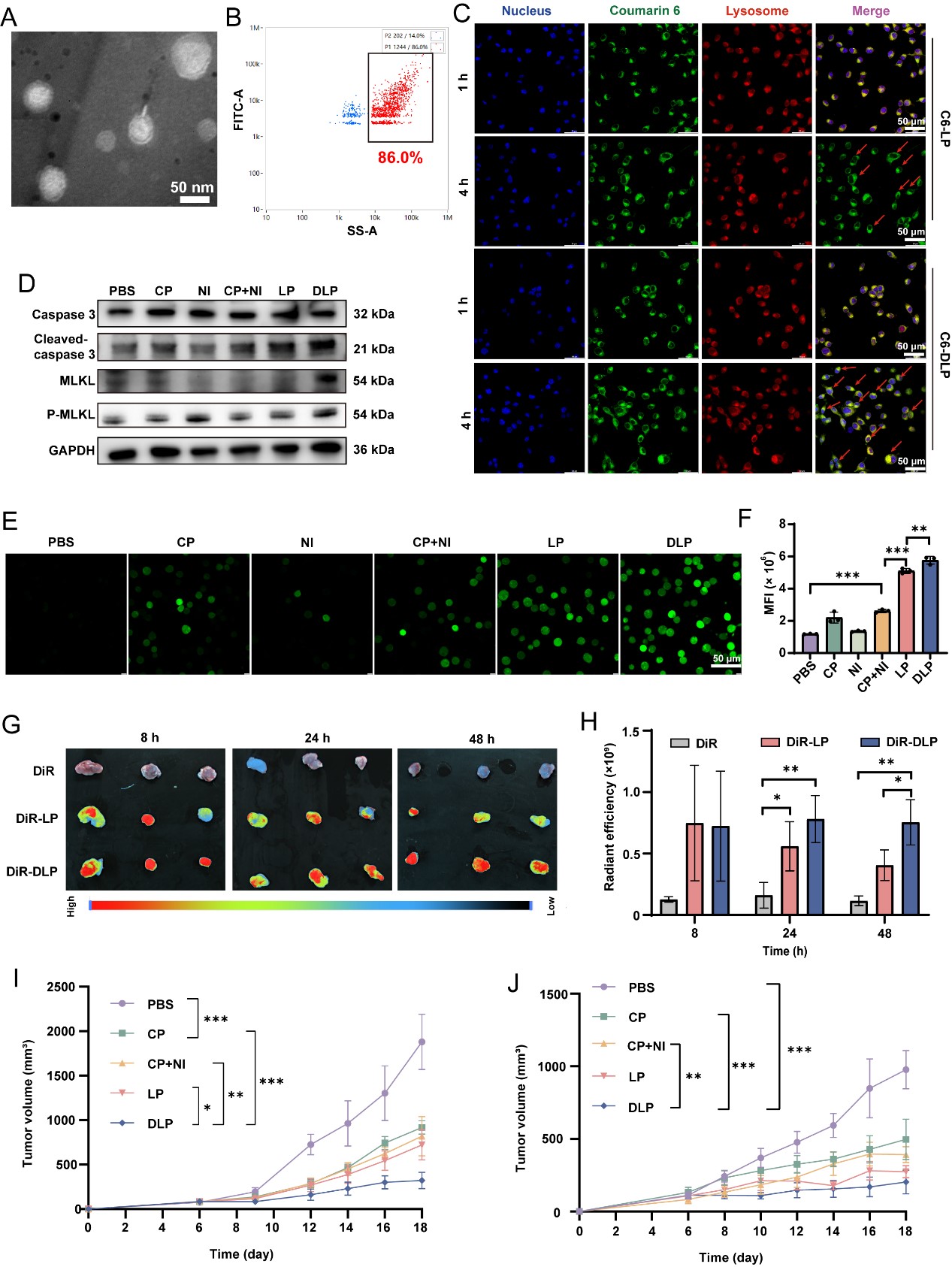 (A)透射电镜图:DLP形貌;(B)纳米流式检测:多肽修饰脂质体效率;(C)共聚焦显微镜图片:CT26肿瘤细胞中,DLP溶酶体共定位与逃逸;(D)CT26细胞部分PANoptosis相关蛋白表达水平;(E-F)细胞内ROS定性与定量分析;(G-H)CT26荷瘤小鼠体内肿瘤靶向性考察;(I)CT26荷瘤小鼠肿瘤生长曲线;(J)HCT116-CP荷瘤裸鼠肿瘤生长曲线。
