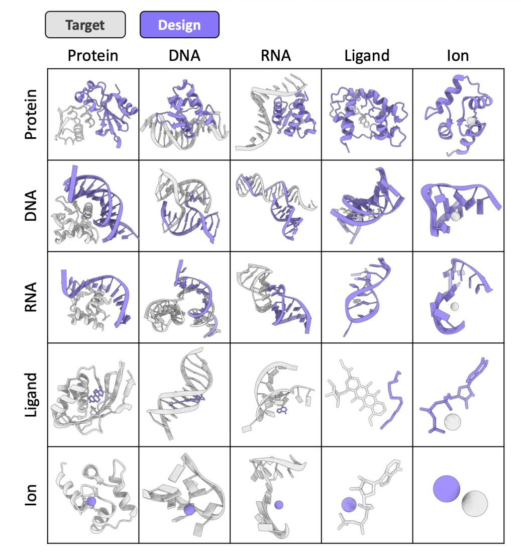 继诺奖团队开发的AlphaFold3和RFDiffusion-AA横空出世后,通用式生物分子结构预测已达到令人惊叹的精度,为AI赋能药物研发领域打下了坚实基础。在药物研发漫长的研发环节中,通用式生物分子设计是下一个AI赋能药物研发领域的“圣杯”。