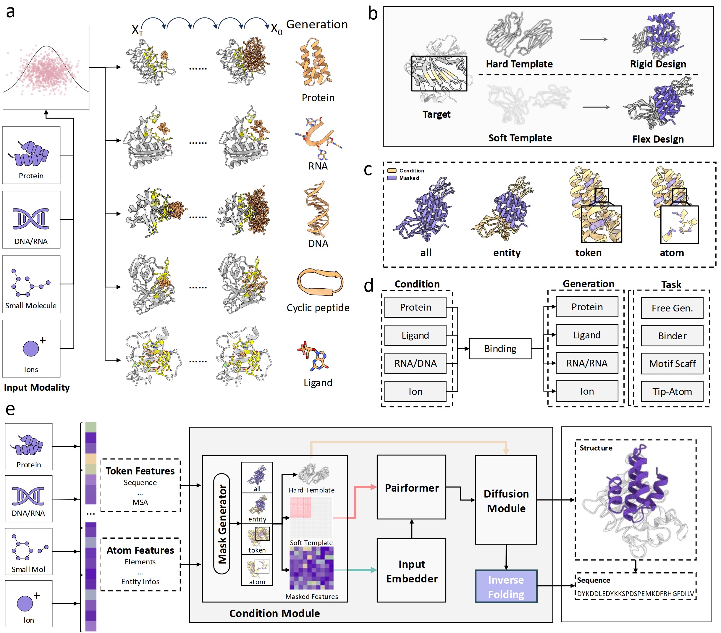 图1基于ODesign的多形态分子设计案例,允许用户在任意类型靶标上指定目标位点,并以精准可控的方式实现蛋白质、多肽、核酸、小分子及金属离子等多类型生物配体的一键式设计
