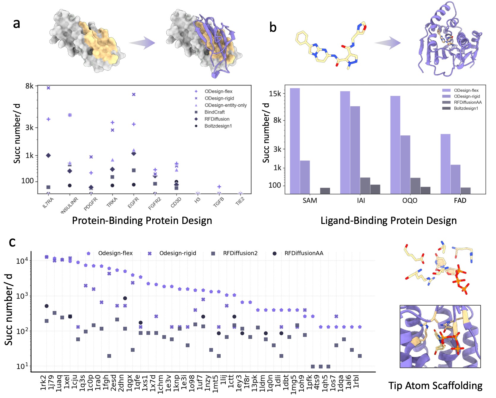 图3 ODesign在蛋白设计任务中展现速度与精度的双重优势。a)ODesign与BindCraft、RFDiffusion及BoltzDesign以单块GPU每日成功设计数量为指标进行比较,ODesign具有显著优势;b)MotifBench基准测试上,ODesign取得相比于RFDiffusion和RFDiffusion-AA更高的蛋白设计成功率。C)在AME数据集上,ODesign在基于骨架的设计上比 RFDiffusion-AA 和 RFDiffusion2 有显著优势。