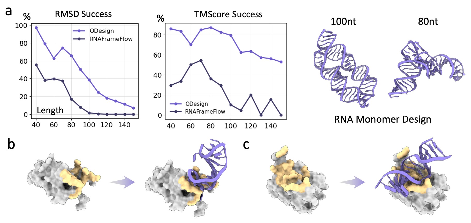 核酸作为另一类具有序列可编程性的生物分子,在分子识别、基因调控与药物开发中发挥着关键作用。然而由于结构数据相对稀疏,现有设计方法局限单一模态,且滞后于蛋白设计领域。ODesign融合多模态分子数据,实现DNA和RNA的统一生成体系,并在60nt的RNA和DNA单体设计任务中实现约60%和20%的RMSD成功率,且生成的复合物具有合理的分子相互作用界面。