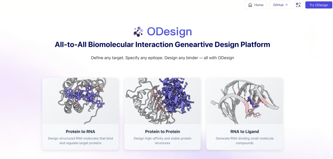 2025年10月27日,由临港实验室牵头,联合上海人工智能实验室、香港中文大学、上海交通大学、浙江大学、华盛顿大学、哈佛大学等合作机构,共同发布国际首个通用分子设计世界模型——ODesign。该模型允许科学家在任意类型靶标上指定目标位点,并以精准可控的方式实现蛋白质、多肽、核酸、小分子及金属离子等多类型生物配体的一键式设计。在多个行业标准测试集上,ODesign显著优于RFDiffusion、BindCraft等主流单形态分子设计模型,标志着生成式 AI药物研发从“单点突破”迈向“通用智能”的关键跨越。
