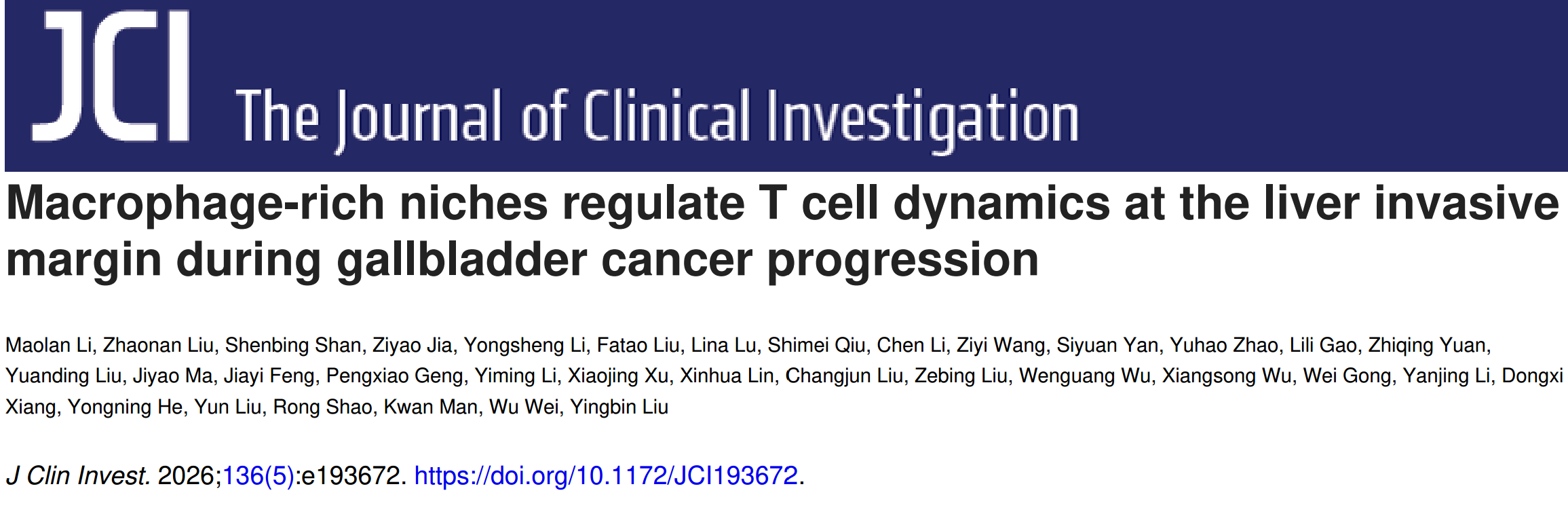 2026年3月2日,临港实验室魏武研究团队与上海交通大学刘颖斌、李茂岚、邵荣团队、香港大学万钧团队联合在Journal of Clinical Investigation期刊上发表了题为“Macrophage-rich niches regulate T cell dynamics at the liver invasive margin during gallbladder cancer progression”的研究论文。该研究整合单细胞转录组与空间转录组技术,系统绘制了胆囊癌肝侵犯微环境的细胞图谱,首次识别肝脏侵犯交界区域特有的免疫生态位结构,揭示了CXCL9+巨噬细胞与LGALS4+肿瘤细胞在调控CD8+ T细胞“招募—增殖—耗竭”动态过程中的核心作用。