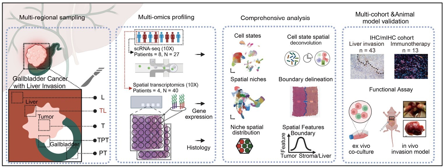 胆囊癌是胆道系统中最具侵袭性的恶性肿瘤之一,其易发生直接肝侵犯的特性是导致手术难度高、预后不良的关键原因。尽管肝侵犯在临床中极为常见,但肿瘤—肝脏交界处微环境的细胞组成、空间架构及免疫调控机制仍不明确。近年来,单细胞转录组技术为解析肿瘤异质性提供了强大工具,而空间转录组学更进一步揭示了细胞在组织中的原位分布与互作关系。然而,在胆囊癌肝侵犯这一动态界面中,免疫细胞的空间组织规律及其功能调节机制仍有待系统揭示。