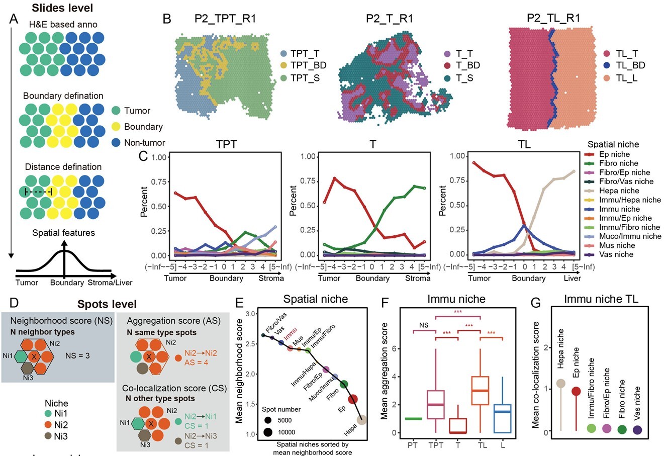 为了定量描绘各细胞在微环境中分布特征,研究团队开发了空间位置分析工具POSST,发现了肿瘤—肝脏边界处的细胞分布存在明显动态变化。