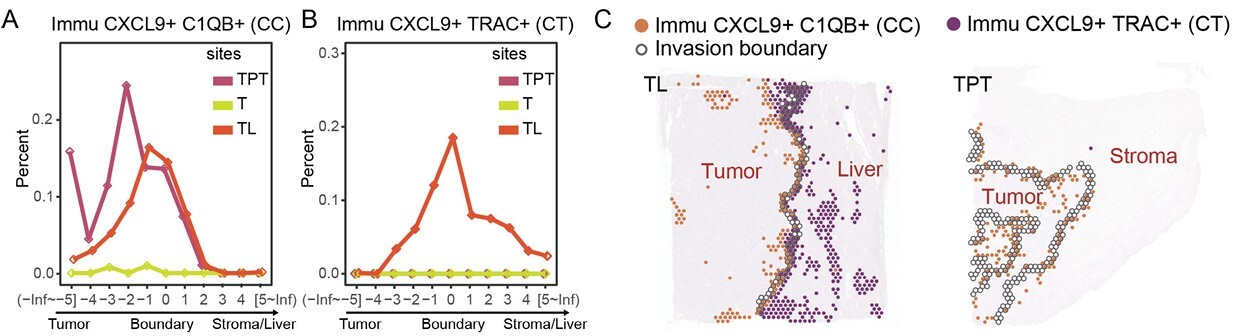 进一步研究发现,肝侵犯边界存在一个富含CXCL9+巨噬细胞的免疫生态位,并可进一步分为两个功能不同的亚区:CXCL9+TRAC+(CT)生态位(近肝侧):招募并促进CD8+ T细胞增殖;CXCL9+C1QB+(CC)生态位(近瘤侧):与T细胞功能耗竭相关。