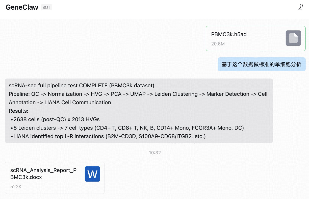 上传h5ad数据文件,GeneClaw 自动完成从 QC 到细胞通讯的完整 scRNA-seq 分析,输出含图表的专业报告。